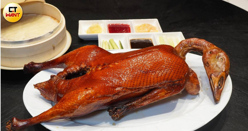 「爐烤片皮鵝」約爐烤40分鐘、控制在8分熟左右,保留鵝肉滑嫩又飽含油香的口感。(3,980元,菜色價格皆須另加10%,圖/魏妤靜攝)