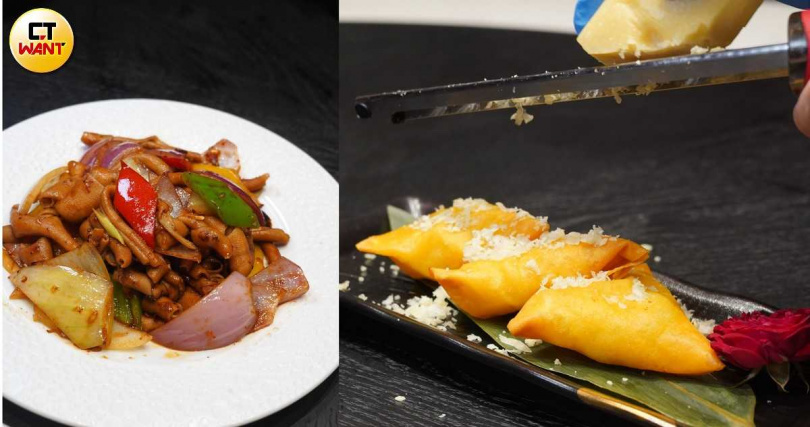 「鼓椒炒鵝腸」(左)入口熱辣鮮香,「落花飛雪燕窩盞」上桌時則會現刨帕瑪森起司,增添鹹香也營造視覺感。(各580元,圖/魏妤靜攝)