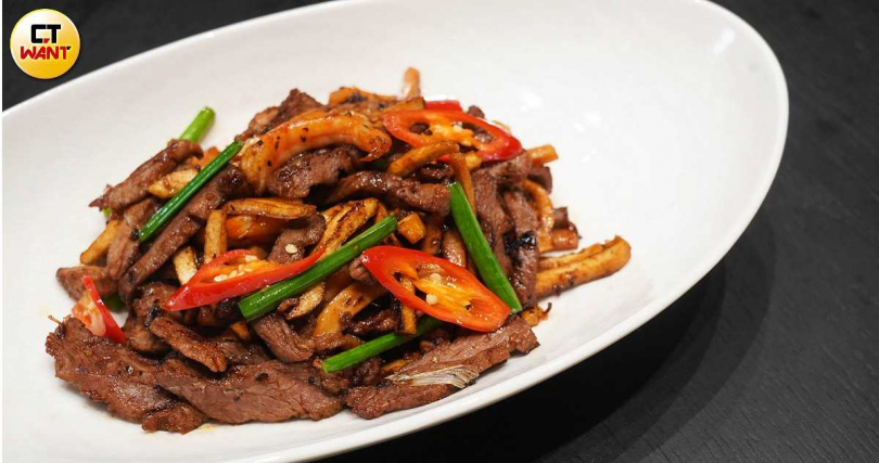 讓人聯想到客家小炒的「XO醬港式小炒皇」用大火快炒鵝絲與蝦乾、XO醬提味,利用海鮮風味與鵝肉交織出多重香氣,僅於片鵝三吃提供、不供單點。(片皮鵝+300元,圖/魏妤靜攝)