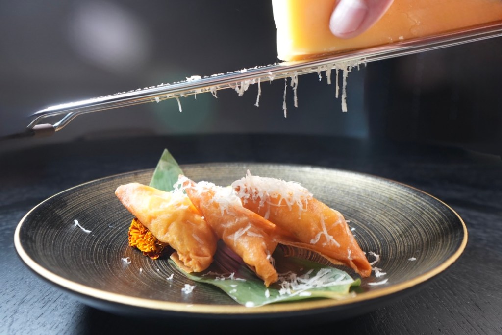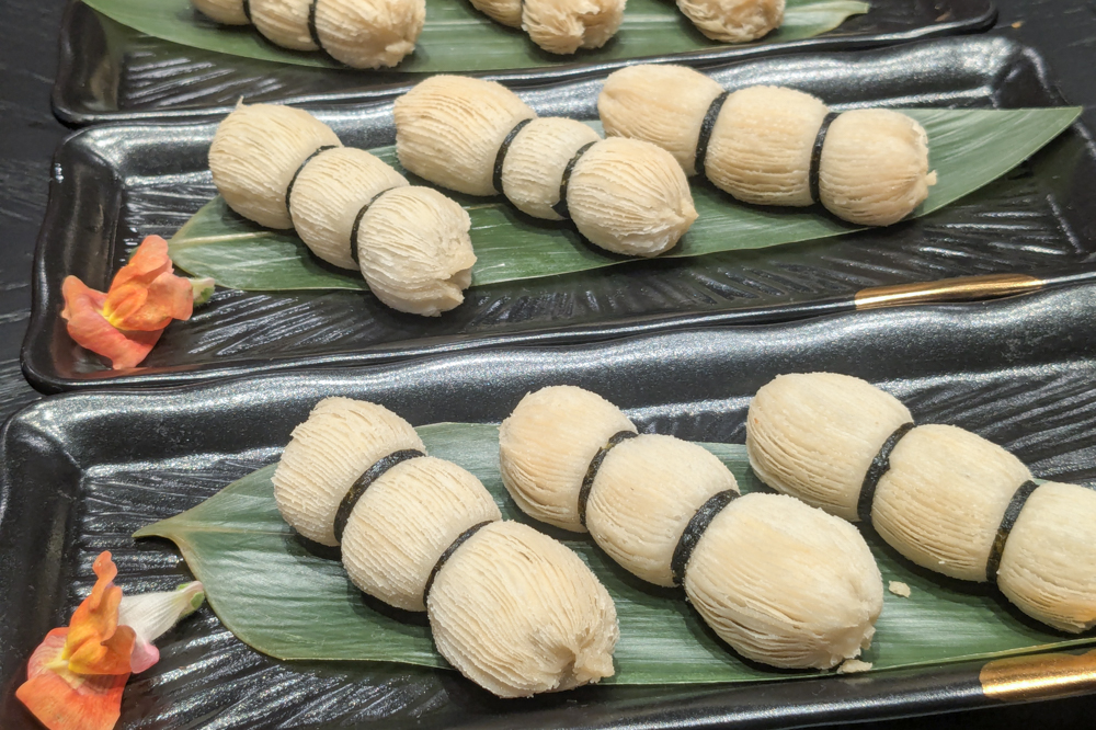 外型超討喜的「芋香蓮藕酥」,靈感取自港式天鵝酥,手藝細膩繁複,內餡選用自製的綿密芋泥,甜香濃郁、不過分甜膩,搭配酥皮搓揉成微胖長條狀,中段再用海苔輕包固定形體。經高溫油炸後,外皮炸出層層如花瓣般的酥鬆紋理,色澤金黃、香氣撲鼻,入口酥鬆即化、輕盈不油。