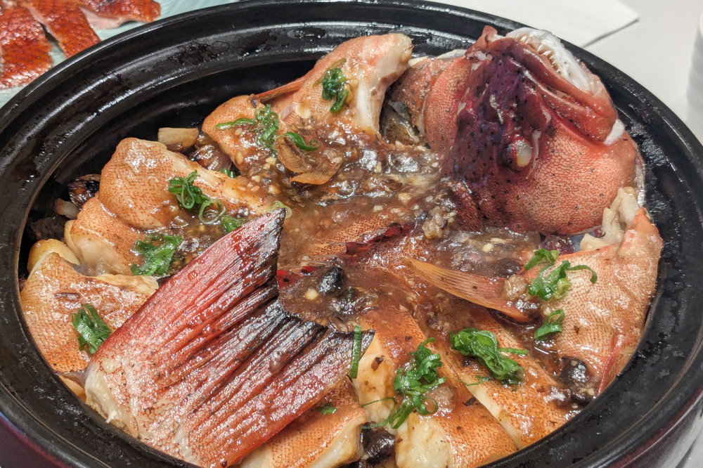 以老粵菜做法呈現的「生焗七星斑」,是嚴選馬爾地夫的一斤重七星斑,肉質細緻鮮甜、油脂含量適中,以蝴蝶刀片開,保留魚頭與魚尾以保持完整外觀與飽滿感。特別是運用生焗技法,不預先煎炸,而是直接蓋鍋,將魚以砂鍋氣燜熟,鎖住鮮味與水分,並與鍋底香料融合,當魚肉吸飽鍋香與豆豉的鹹鮮,細嫩中帶膠質,入口即釋放出多重香氣,層層交疊。