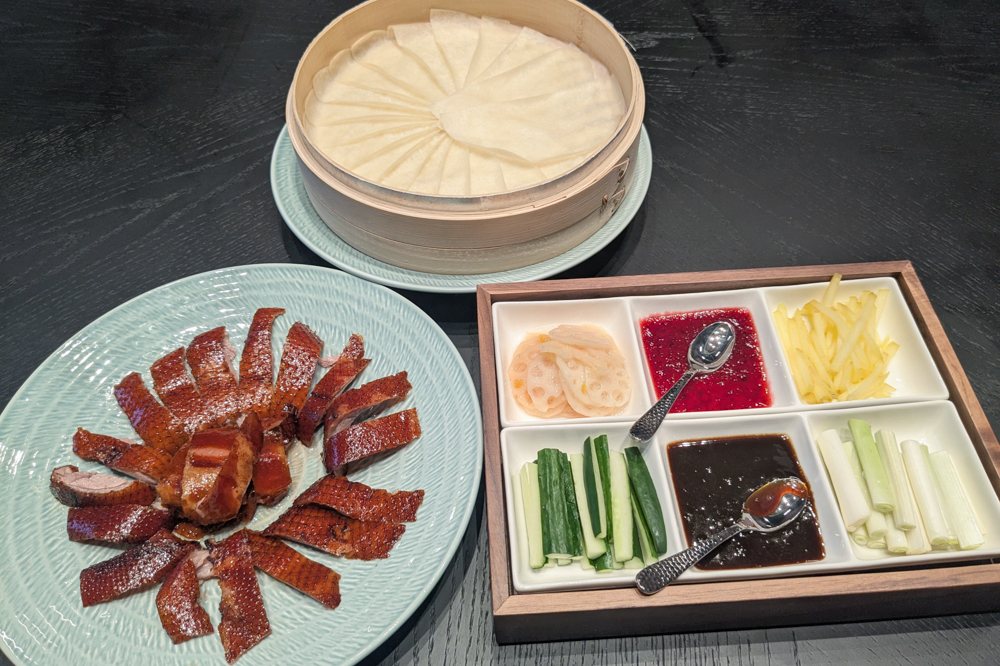 第一吃「經典片皮鵝卷」是薄切鵝皮搭配手工麥香餅皮,可搭六宮格配料,包含乳豬醬、柚香蓮藕、蘋果絲、黃瓜條、三星蔥段,還有最特別的紅莓醬(以蔓越莓調製冰梅風味),自由組合口味,層次多變。第二吃「滷汁斬鵝腿」選用厚實鵝腿斬件,有別一般冰梅醬搭配,改佐以濃郁滷汁,鵝肉香氣深邃、醬香入骨,是傳統粵菜的經典演繹。