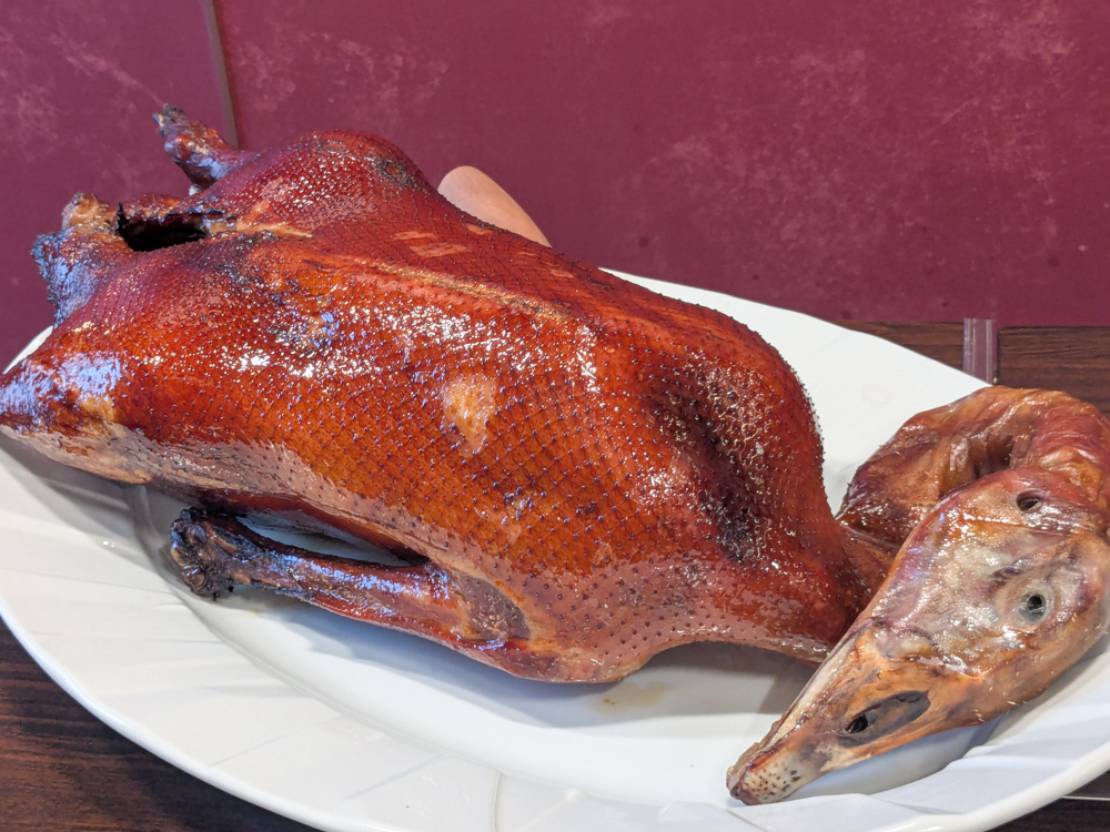 菜色首推「爐烤片皮鵝四吃」,嚴選來自雲林在地飼養、重達 5 公斤的白羅曼鵝,用鴨鹽醃入基底,佐以融合中藥材與海鮮醬的獨門乳豬醬,塗抹鵝腹內層,再置入香葉等中藥材提香。全程爐烤約 40 分鐘,精準控制約八分熟。